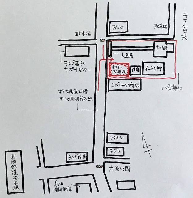 八雲神社の駐車場は、真岡鐡道茂木駅前通り(県道27号線)に面した